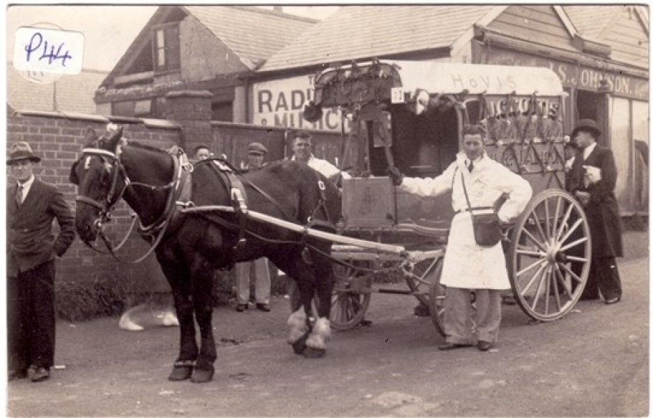 In this photograph the baker wears the traditional attire for delivering bread post 1920, a white overcoat. Before this date day dress would have been worn by the delivery men and boys, a shirt and tie, tweed jacket, trousers and gaiters. Baker's wore white aprons in the kitchens and in the shop to prevent their clothes from being covered in flour.