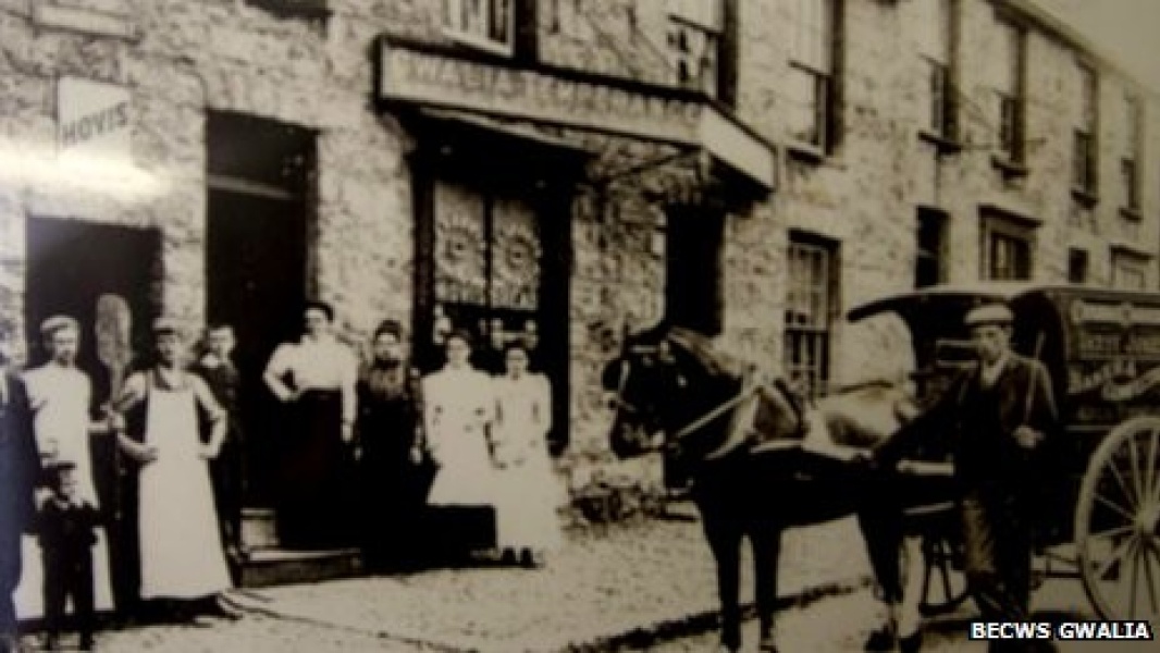 A family of bakers standing outside their shop in Gwalia in Wales. This photograph was taken around the turn of the 20th century.
