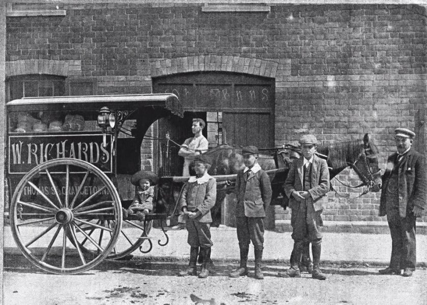 This is a photograph of several generations of baker's with the smallest sitting in the footwell of the cart. The photograph illustrates how every family member was involved with the business. The Baker's Cart is a cab fronted two wheeled vehicle with nicely curved iron stands.