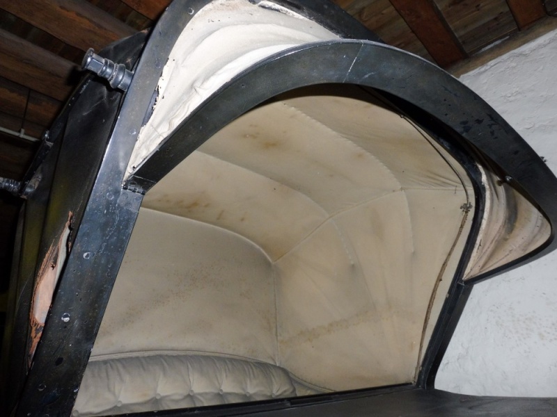 The buttoned seats and lining of the head are in a buff colour material. The coachman’s seat has a valance in a buff colour box cloth with broadlace edging.