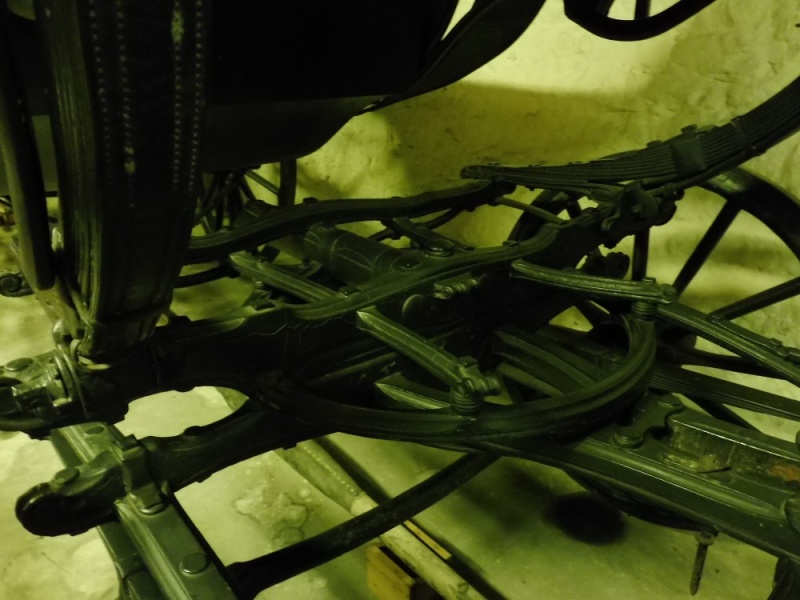 The wheels are 12 and 14 spoke English pattern on collinge patent axles, iron shod. Both axles are compassed down. The Barouche is eight sprung with C and elliptic springs. The perch is compassed down to match the profile of the body of the carriage. It has a sharp angular profile at the fore carriage and a gentle curve at the hind carriage. The splinter bar is also compassed down. There is no brake fitted to this carriage but there is a hook for the attachment of a drag shoe which is missing.