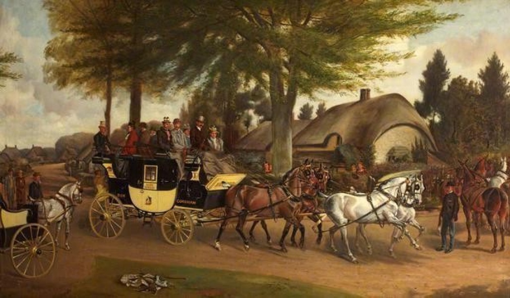 The Bath to Devizes Stage Coach pulls up in a village for a change of horses. Painted in 1892 by Alfred Wheeler (1821-1903).