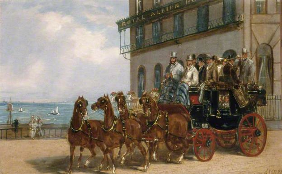 The Brighton to London Coach standing in front of the Royal Albion Hotel in Brighton. Painted by H J Jones in the 1860's. Oil on canvas.