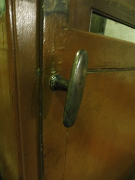 On the back is a turned wood handle for pushing the Brouette which suggests that a footman may have followed the carriage and assisted when needed. At the front is a single door mounted on two hinges with a silver plated brass T bar handle. The door has a lowering window with plain wood frames and there are lowering windows in each upper side panel. The shafts are fine and run along the side of the body protruding at the back. They are bolted to the side panels of the Brouette and have leather served tips with two brass attachments that a leather strap would be buckled to for the chairman to pass over his shoulders.