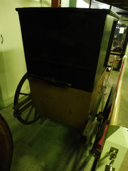 The Brouette is a rare carriage. This example has a standard Sedan Chair shaped body with a door at the front, two shafts and a wooden handle at the back. Painted in brown and black with a buff coloured upholstery inside.