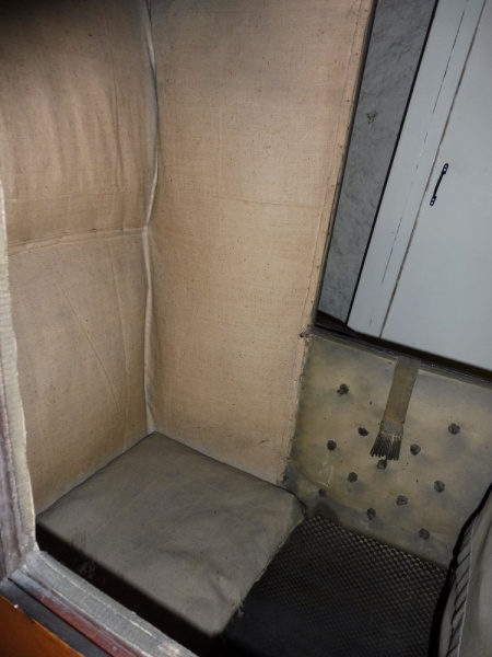 The lower body, wheels, shafts and springs are painted brown with the upper body painted black. The step is also painted black on the upper side. It does not appear to be the original paintwork. There is no lining or decorative motifs. Inside the Brouette has lost the majority of its upholstery. At the front and sides is a plain buff colour material, the sides are buttoned. There is a lace surviving on the lowering window to the left. A modern looking buff calico material covers the seat panels. A jacquard pattern vinyl covers the lower panels inside.