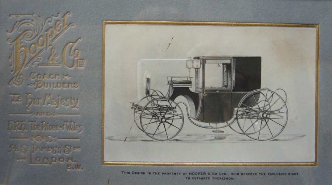This is a design and promotional card for the coachbuilder's Hooper and Co of London. The carriage depicted is a Brougham on a perch and sprung on C springs for a pair of horses.
