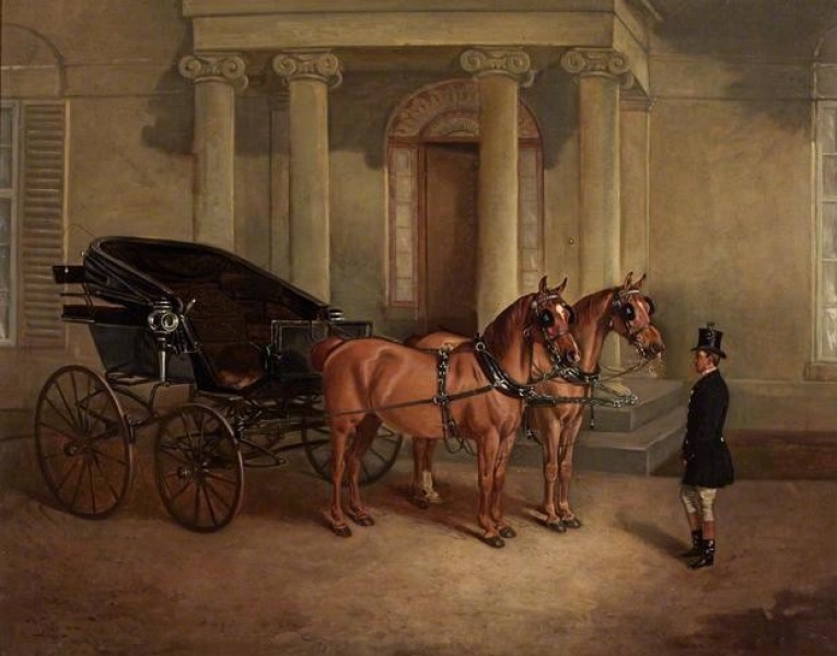 The artist, John Alfred Wheeler, has a fine eye for detail and clearly knew about the construction and detail of carriages and harness. He has observed the leather pouch that holds a clock, hooked over the dashboard and has painted the folds of the leather head on the carriages with utmost care. The quality of the finish of this painting is almost photographic.