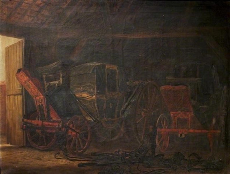 An atmospheric painting of two Berlin coaches in a barn with harness strewn across the floor in the foreground and hooked on the splinter bars. The carriages depicted in the painting date from the mid 18th century.