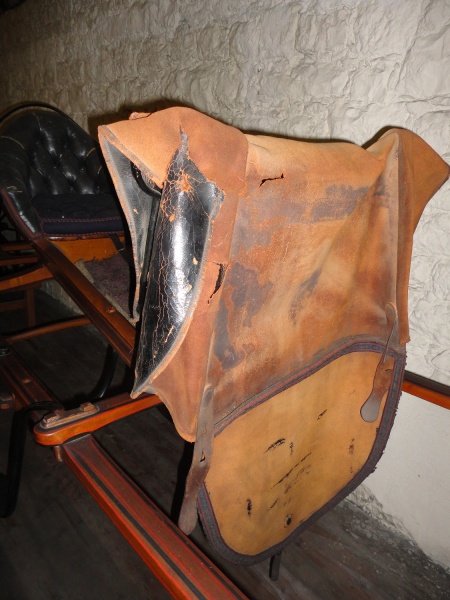 The body is a beautiful shape with a curved chair back and flat underside. The driver would sit in this carriage with their legs out almost straight in front of them hence the cradlelike appearance. A tall dashboard is at the front of the body of the carriage. Over this the original leather apron is draped. Pulled up over the occupant’s legs and attached to the knobs on the iron single seat rail and combined with the wool rug on the floor of the carriage, this made a cosy way to travel on cooler days.