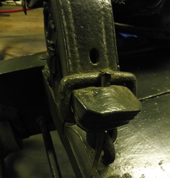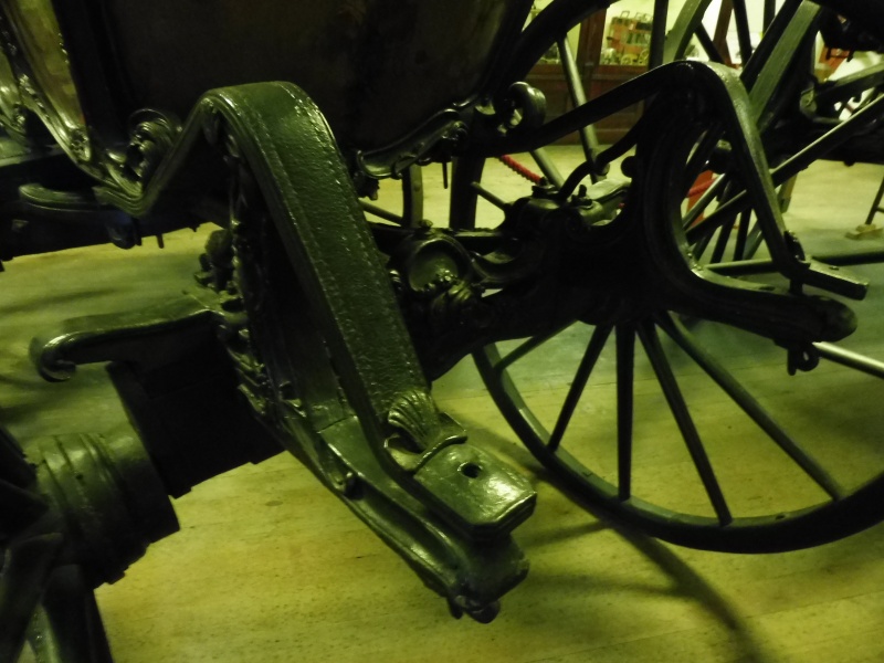 The undercarriage is heavy and less well executed than the body. At the front is a footboard or platform and to this the leather braces are attached to, they are passed through a hefty buckle which is shackled to an iron loop that passes through the wood platform. The splinter bar had been turned to give it some shape and sits on top of the futchells. It is supported by two iron braces fixed to thefore carriage with decorative knops halfway along. Swingle trees with a curved profile and scroll ends are fitted via think leather straps that are kept in place with iron staples. At each end of the splinter bar is a step with a plain rectangular tread. A second step with a circular tread is on an iron stay bar. This bar runs from the end of the splinter bar to the hubs on the front wheels and is designed to spread the draught of the horses across the whole of the fore carriage and not just from the swingle trees. On the nearside towards the front of the body of the carriage is a third step with a plain rectangular tread.