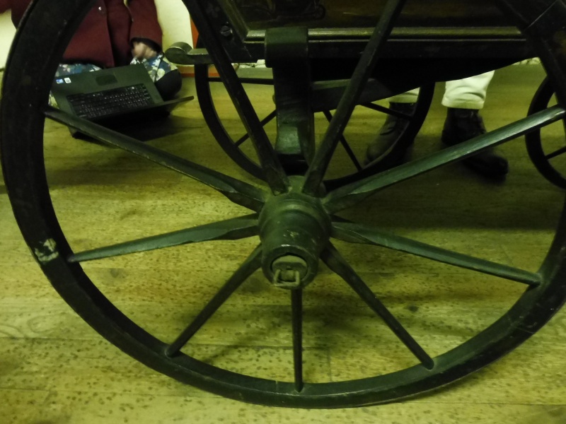 The carriage body is mounted directly on to the axles with no springing. At the front is the remains of a tiller, most of which has broken off and is now missing. The wheels have 8 spokes at the front and back and thin iron tyres.
