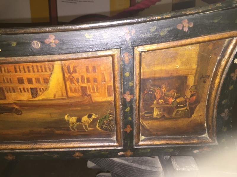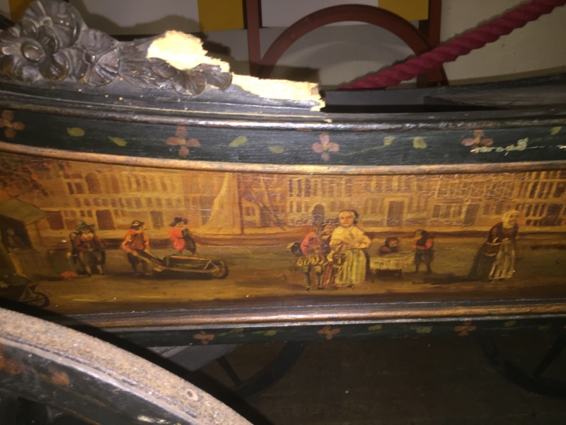 The small panel at the front of the carriage on the nearside has a painted scene of three men in a inn. The colours are muted. In the main panel is a Dutch landscape, quite roughly painted, with a cottage on the left and a view of a church steeple and lake. To the right of the composition is a tall wooden fence and in front of this a scene of a family seated down to a meal. The frame around the panel is panted black with delicate pink flowers.