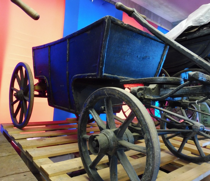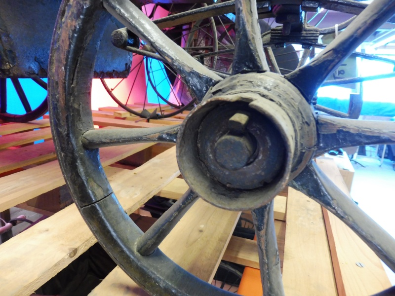 The carriage is sprung on elliptic springs at the front and back. The off side rear spring is missing. At the front are 8 spoke, iron tyred wheels with 10 spoke wheels at the back with common axles.