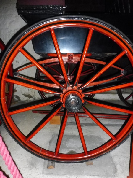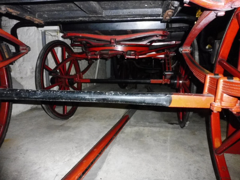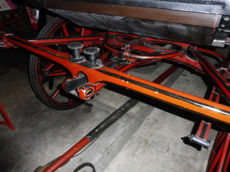 The wheels are English pattern with 10 spokes at the front and 12 at the rear with rubber tyres and on collinge patent axles. The axles are both straight. Sprung on elliptic springs at the front and back. A footbrake is fitted to the rear wheels. The roller bolts and the pole are leather served. Leather pole straps are attached to the pole.