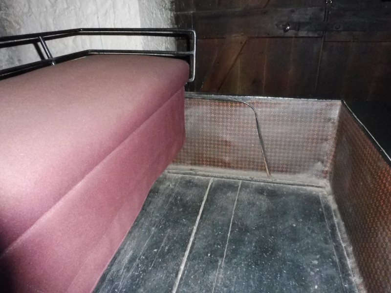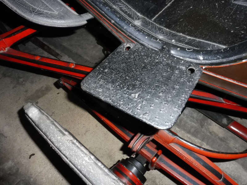 The paintwork consists of the body being black with red lining and the undercarriage is in scarlet with black lining. The seat back is painted dark brown/maroon. On the back panel are the initials ‘C M E’. The seats have been upholstered in a brown box cloth. This is not the original material. A rectangular jagged step plate is fitted to the front on both sides for the driver and passenger to mount the carriage. Each plate has two holes in thatenables a folding wooden ladder to the attached.
