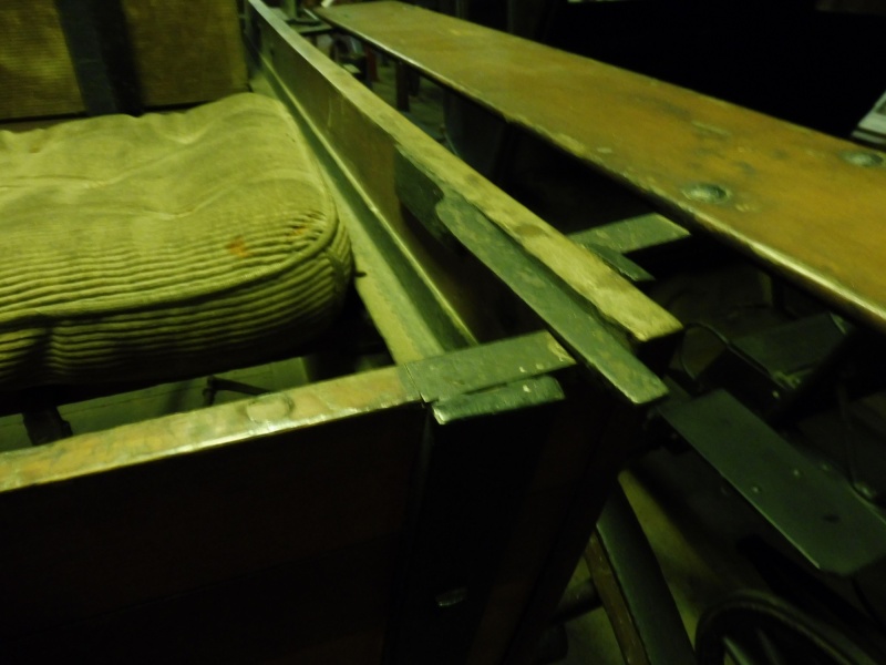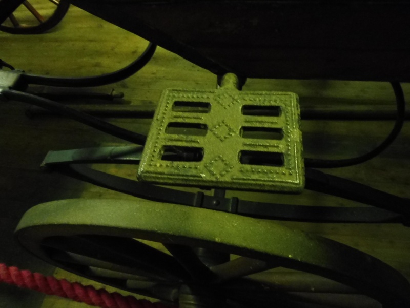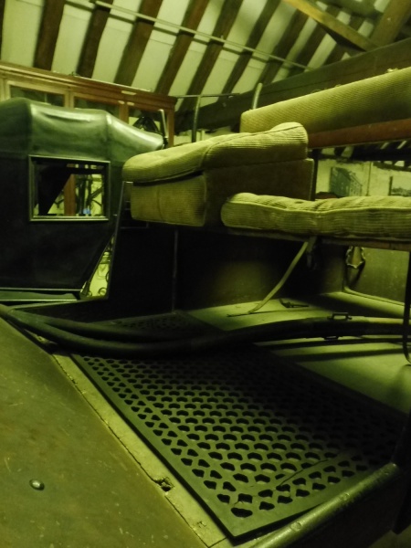 At the front of the carriage is a sloping foot board attached to the forecarriage by an elegantly curved bracket. A wood dashboard is bolted to the foot board, it has an iron grab handle on each side. There are also iron grab handles bolted to the front edge of the side panels.