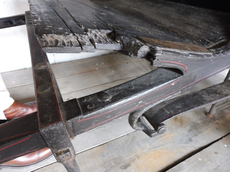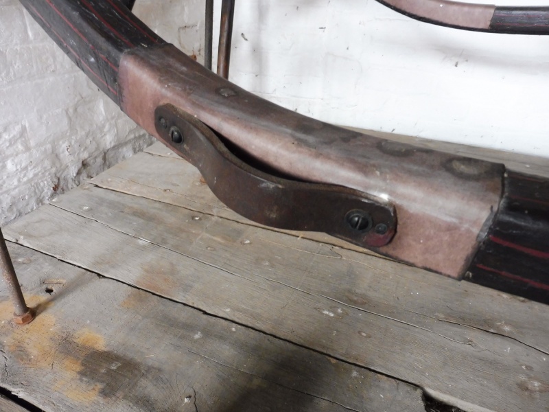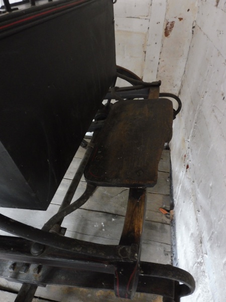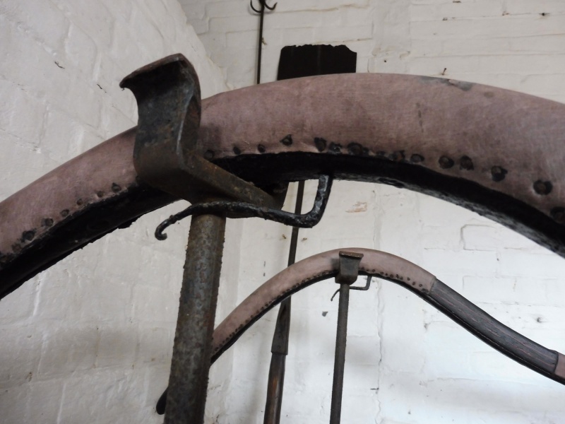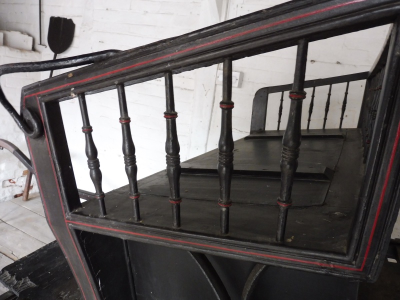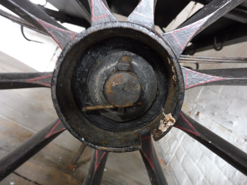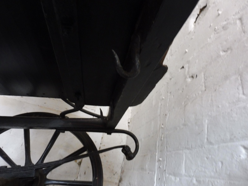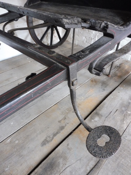 The footboard slopes upwards and is supported at the front by small curved iron supports attached to the shafts, the nearside support is missing. At the front corners of the seat rails are grab handles. Some attempt has been made to make them look elegant as they curve back on themselves and reflect the similar curves of the brackets that support the body. At the point where the splinter bar meets the shafts, two iron steps are fitted. They are bolted over the top of the shaft and have a curved bracket with a semi-circular plate, the plate has a hole in the centre. The swan neck shafts are served with brown leather at the tip end that is tacked on rather haphazardly and where the leather breeching fittings are attached. Elegant iron tug stops are fitted to the underside of the shafts and there are trace hooks at the splinter bar ends. The wheels have 10 spokes and iron tyres they are on common axles. On each side is a side spring which are not mounted centrally onto the axle.