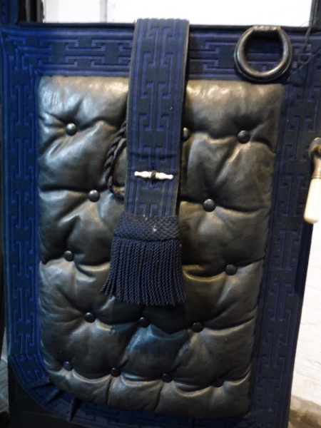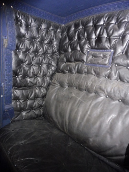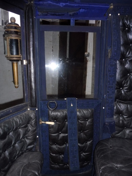 The body and undercarriage are painted black with red lining on the wheels doors and lower body panels. External trimming consists of a coachman’s seat that has a cushion covered with the original blue box cloth. A wedge seat is in a similar box cloth but of a later date. The seat drop is also covered in blue box cloth. Inside the upholstery is of black buttoned leather with blue broadlace with a Greek key pattern. The heaven is covered with blue box cloth and there is a plain blue carpet. A small squab covers the window and is upholstered in black buttoned leather with blue seaming lace. All internal furniture is of bone with the door rings covered in black leather.