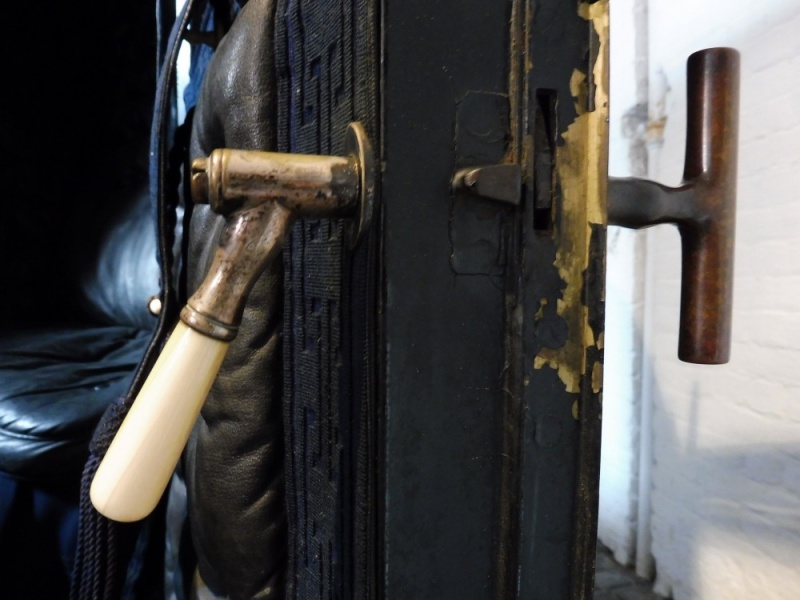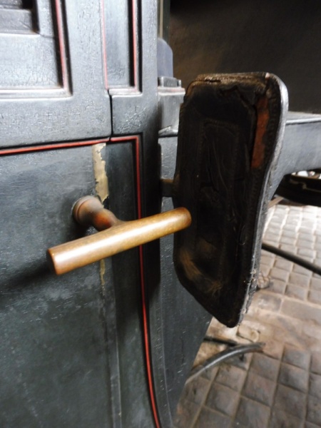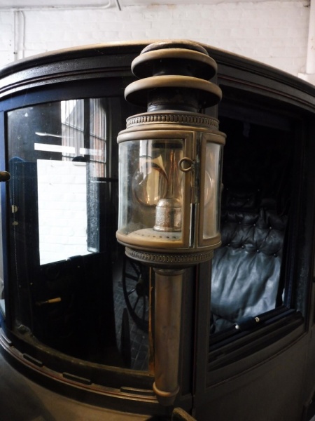 The doors are hung on concealed hinges and have brass T bar handles on the outside and bone handles on the inside. The brougham has lowering windows in each door with blue velvet covered frames. A small rectangular window is in the back panel of the body. An iron step with a rectangular tread is fitted each side for access to the body of the carriage. On either side of the footboard is a step with a plain rectangular tread. The carriage has fixed cylindrical lamps with three tier chimney’s, brass furniture and black paintwork. They are the original lamps for this carriage and made by Thorn of Norwich.