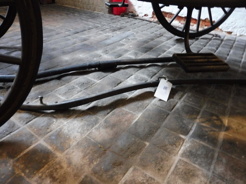 This brougham has 14 and 16 spoke English pattern wheels with the original rubber tyres on collinge patent axles. The rear wheel on the nearside is missing its tyre. Original independent shafts survive but one is broken.