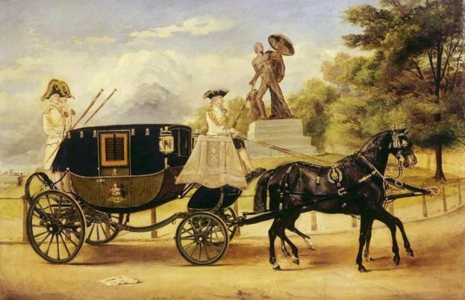 This is a painting where the artist has observed his subject and depicted it in meticulous detail. The coach is a typical mid 19th century town coach painted in dark green and black, on an undercarriage with a perch and C springs and with a Salisbury boot. The hammer cloth is of a colour that matches the livery of the coachman and footmen. The windows have the shutters up, suggesting that Viscount Eversley is not riding in the coach at this moment. It was not uncommon for the nobility to send their coaches to an event empty to represent the family. The horses are in full collar black harness with rosettes on their headpieces that also match the livery.