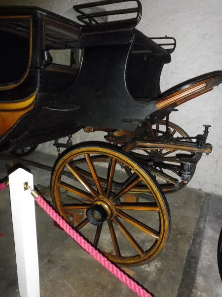 At the back is a footman’s platform. It is small in comparasion to those on chariots or coaches. The standards and cross bar are carved with an acanthus leaf motif. There are two iron pump handles of an elegant profile. There does not appear to be any sort of step to mount the platform. To mount the inside of the carriage is a large semi-circular step bolted to the underside of the body, its cover is attached to the base of the door. The coachman’s seat is mounted by a single step mounted on a bracket attached to the forecarriage. This has an oval tread.The edges of the wheel hubs are jagged for use as steps. Lamp brackets are attached to the upper front side panels. When the front is folded down these must sit neatly alongside the seat riser.