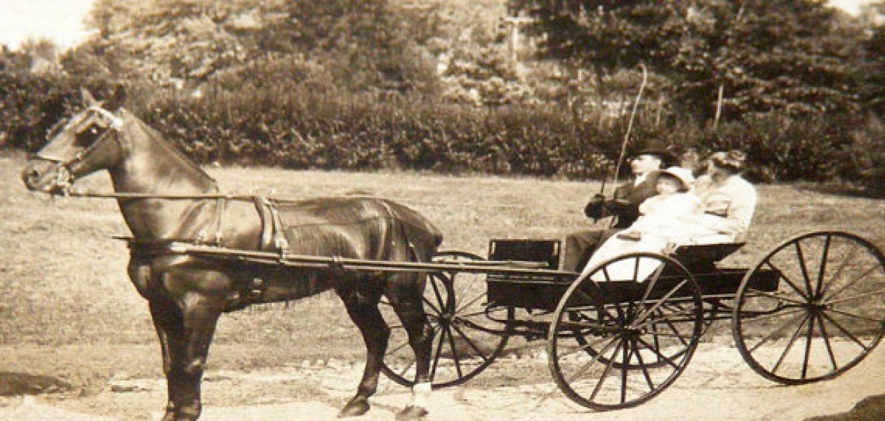 This photograph was taken around the turn of the twentieth century and depicts a gentleman driving his family out in an American carriage know as a Side Board Buggy. They are an unusual carriage to take ones family out in as they were more designed for exhibiting a high stepping horse at speed than as a mode of transport for a family outing. The carriage seats just two people side by side, here the child sits on its mothers lap.