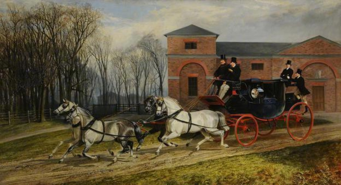 A gentleman drives a team of grey horses harnessed to a Park Drag past the stable block of Burton Constable Hall in Yorkshire. Painted by Joseph Walker around 1860.