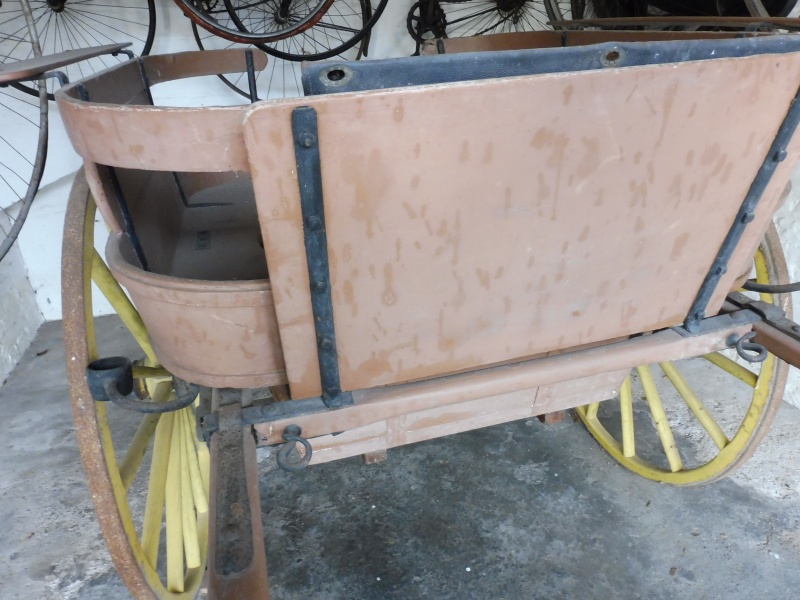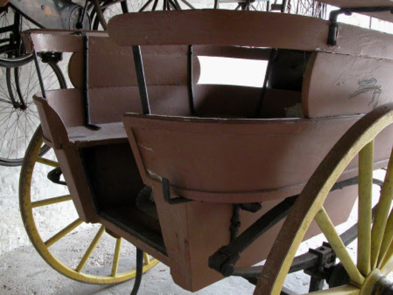 Governess Cars, sometimes called Tub Carts for obvious reasons, have a deep tub-shaped body with access through a door at the back, and seats each side. They were often used by a governess (hence the name), or possibly a mother, to take the children out for a drive. She would drive sitting diagonally in the back right-hand corner. Although the seat and the cushion on the right hand side have been shaped for this purpose, this would still have been difficult and uncomfortable. Only the quietest pony, or sometimes a donkey, was suitable to be driven to a Governess Car, not only because of the awkward driving position, but because it was difficult to get out quickly and run to his head if she needed to. The cranked axle allows the body to be mounted lower, dropping the centre of gravity and making it difficult to overturn.