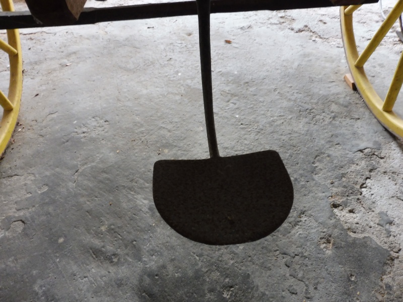 Attached to the underside of the body at the back is a step with a semi-circular tread to access the carriage. Somewhat bent lamp brackets are bolted to the underside of the seat boards there are no lamps. The shafts are mounted on fulcrum stays at the front of the footwell and on brackets bolted to the side of the footwell. They have iron tug stops and breeching staples. At the point of the breeching staples the shafts show signs of heavy use as the wood has a groove worn away. Pig tail trace hooks are attached to the draft bar.