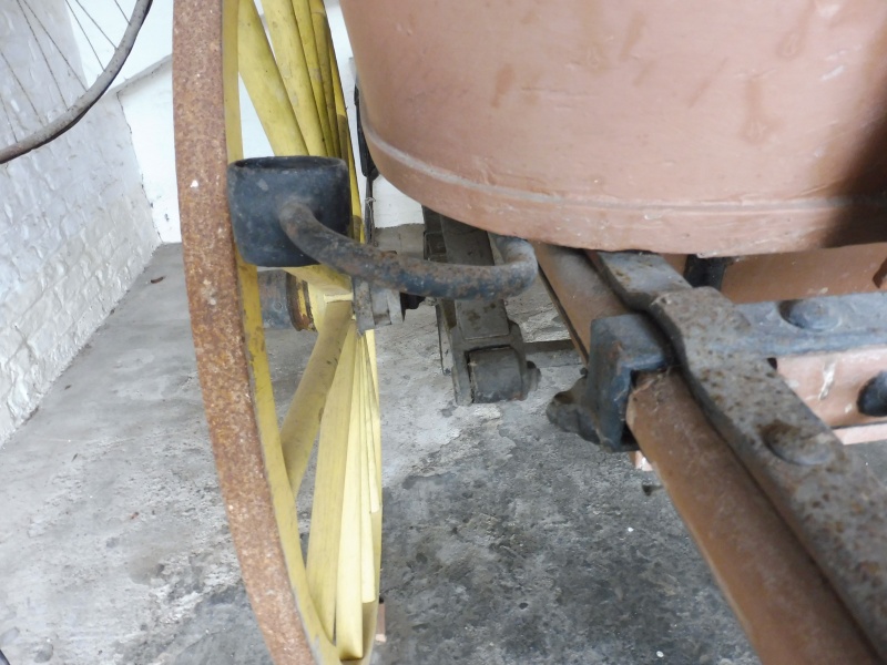 The wheels are warner pattern with 14 spokes, iron shod with collinge patent axles (the caps are missing). Sprung on elliptic springs attached via plate brackets bolted to the underside of the seat boards and to the sides of the footwell.