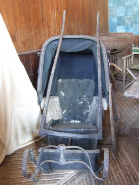 Invalid Carriage for a single pony or donkey. This carriage has a black leather covered canvas head. The body has a curved profile and is sprung on C springs. The shafts are probably a later addition as there is a pushing handle at the back and fittings for a steering tiller. Upholstered in blue cloth and painted black with red lining.