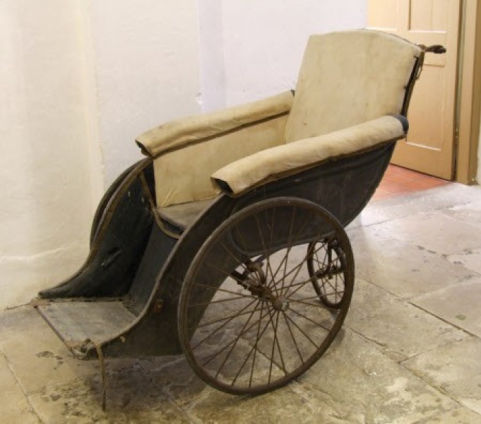 Invalid carriages were designed either to be pulled by a small pony or donkey or pushed along by a servant, relative or friend. This example is person propelled via the carved wood handle at the back. They were a means of enabling the elderly or infirm to take some air. This invalid carriage is unusual as it has two wheels at the front and the single wheel at the back.