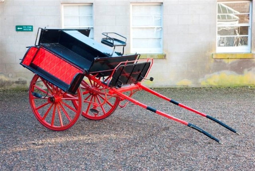 The Jaunting Car has 14 spoke Warner wheels with rubber tyres in clincher channels on collinge axles. Deep branched side springs are mounted on deep scroll irons on the front and similar scroll irons are behind with a stay at the end. The shafts are on span irons to the underside of the seat boards with a heavy splinter bar clipped to them. Fixed tug stops and one pair of breeching staples are on the shafts and there are trace hooks on splinter bar.