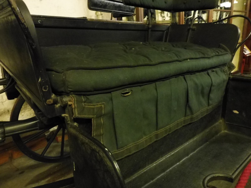 Running along the centre of the shafts and supported on iron brackets is a storage box with a hinged lid for the passenger to put their luggage in. Fixed to the rear of the box is a longitudinal panel which forms the seat sides with leather splash guards at each end. A similar panel is at the front. The panels have rounded corners and slightly exaggerated curved iron grab handles. The luggage box forms the back panels of the seats with lazy backs fitted to the seats at the rear of the carriage which are upholstered in a blue/green box cloth. A pleated seat drop is also in blue/green box cloth and has an broadlace in a similar colour with a gold stripe.