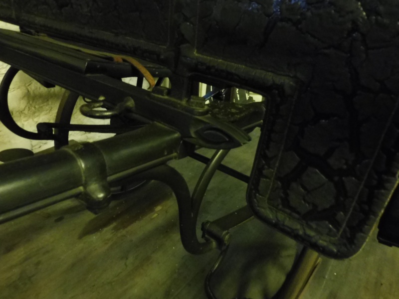 The driver of this Jaunting Car would sit on the front end of the luggage box with their feet on a small rectangular footboard which is mounted on a cross bar fitted to each shaft. There is a leather strap on the footboard for the driver to slip their toes under for a bit of security. Just behind the cross bar on the top of each shaft is a lozenge shape foot tread. An enormous leather dashboard is bolted on to the cross bar. It has a slightly curved profile and overhangs the width of the shafts providing complete protection for the passengers. The surface has aged in to the ‘river and island’ appearance.
