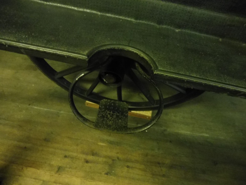 On each side hanging over the wheels are foot boards for the passengers to rest their feet on. They have leather end panels with rounded corners. The back board is of wood as is the footboard which has a recess in the front edge at the centre point. The footboard is covered with a green patterned lino. A step is fitted to the underside of the footboard where the recess is. It consists of an iron loop with a square jagged tread.