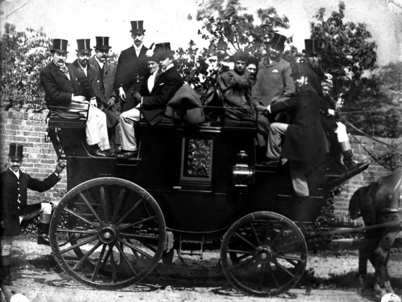 A photograph depicting a coach with guests all looking towards the camera. On the left on top of the coach is a man called Billy Meikle. The coachman and groom are dressed in livery.
