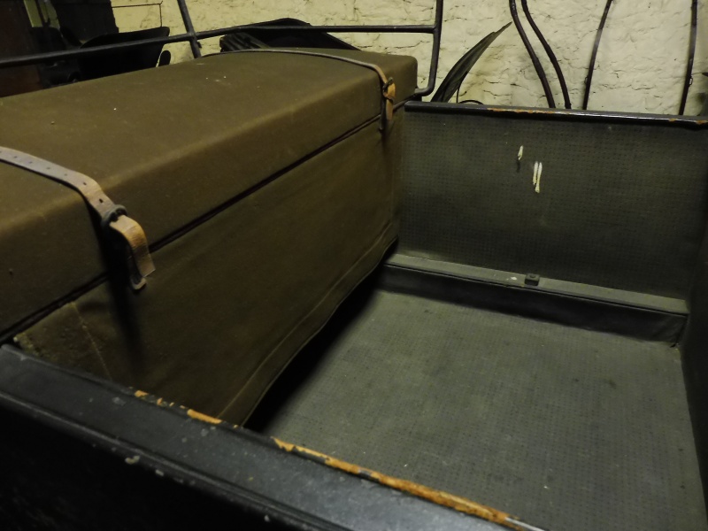 The shape of the body is also classic with an angular profile with the floor of the carriage being straight, sloping up at the footboard. The sides are also straight and form a large foot well behind the driver’s seat for the storage of picnics etc. A groom’s seat is at the back of the carriage, facing forwards. It has double seat rails, a leather seat skirt with brass beading painted black and a seat cushion and valance covered with a buff box cloth. The cushion is secured to the seat via two leather straps. Covering the sides and floor of the back foot well is a patterned lino.