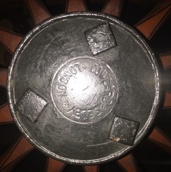 The wheels are 12 and 14 spoke English pattern on mail axles with iron tyres. The axles are straight and substantial. Brass axle caps are inscribed with the maker’s name.