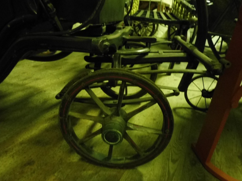 The wheels are 8 and 10 spoke Warner pattern with rubber tyres . The front wheels are on Collinge patent axles, the rear on common axles, which is curious and suggests the carriage has had some changes over the years. The rubber is missing from the nearside rear wheel, and in a fairly poor state on the other three wheels.