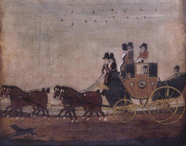 Oil on canvas painting of the Oxford to London Coach by John Cordrey, late 18th century.