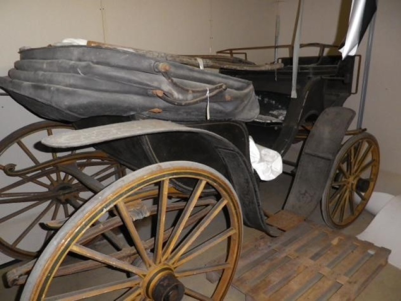 A Panel boot Victoria with a body has a curved profile. There is a fold down seat in the boot under the coachman’s seat. Leather wings extend from the top of the front wheel, downwards to a platform step. They then extend upwards and finish just past the back panel. The coachman’s seat has single rails. This carriage has a leather head lined with green wool cloth and a leather dashboard. Lamp brackets are fitted to on each side of the coachman's seat, there are no lamps.