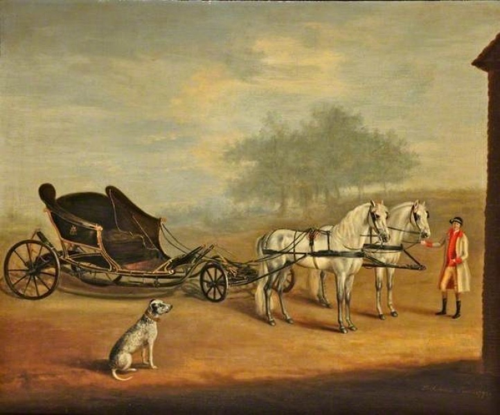 Oil on canvas painting of a pair of grey ponies harnessed to a phaeton by Francis Sartorius (1734-1804)