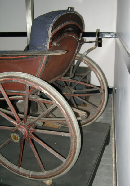 This carriage was used by Queen Victoria at Osborne House. The dash board was made higher than normal as the Queen felt it inappropriate to see her pony’s bottom! It is painted in the royal colours of maroon, lined bright red, and has the royal cipher on the side panels. The position of the brake lever shows that the attendant (perhaps even the celebrated John Brown) walked behind the carriage and could apply the brake when necessary. This carriage was built at the end of the 19th century by Cheverton, Newport, Isle of Wight.