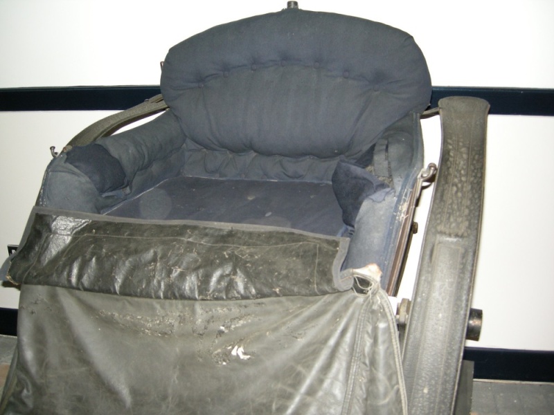 This carriage has a single seat (24” wide). The cut-under body has a convex back panel and on the back of the body are sockets on the waist rails for a leather head to be attached. A socket for parasol is fitted to the top of the back rail. To either side of the body of the carriage are platform steps covered with white ribbed rubber. There are no lamps on this carriage and no provision to fit them. The phaeton has a leather head that has been removed, a leather dashboard combined with front wings that extend to the platform steps and mounted on the footboard, supported by curved stays. Double-curved wings extend from steps to behind the line of the back panel. There is a surviving black leather-cloth apron with brown and cream dogtooth check wool lining, and blue faced wool cloth skirt.