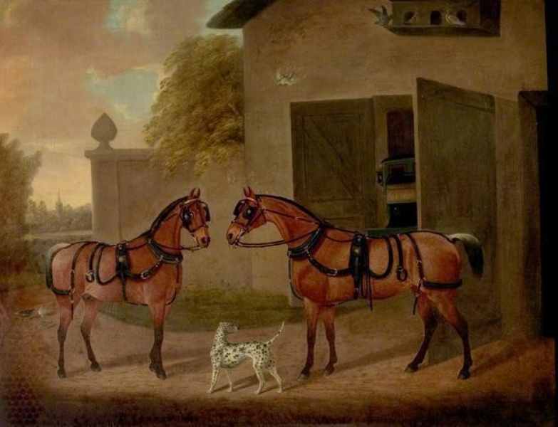 Oil on canvas painting of a pair of roan horses in front of a coach house with a Dalmatian dog. By CliftonThomson (1775-1828).