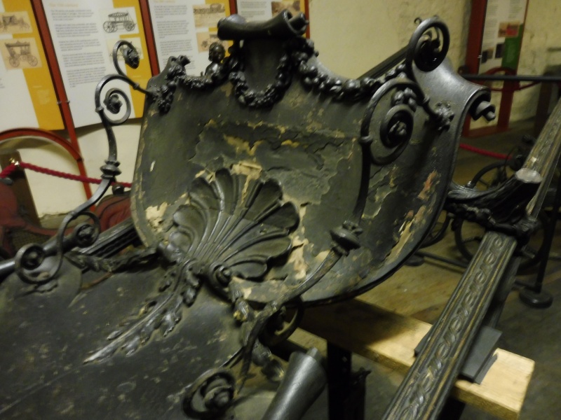 In front of the dashboard is another cross bar which is again heavily carved with swags of leaves, flowers and mythical beasts. The whole thing appears to have received a dose of miracle grow with its winding tendrils of iron work. All four sides of the shafts are carved with a stylised floral leaf pattern. They are very straight and long and were attached to a saddle pad at a high point.