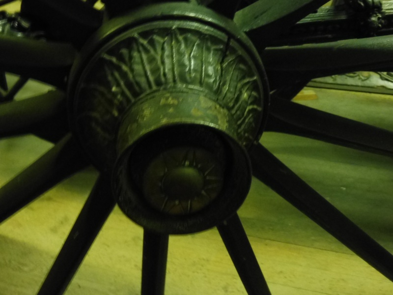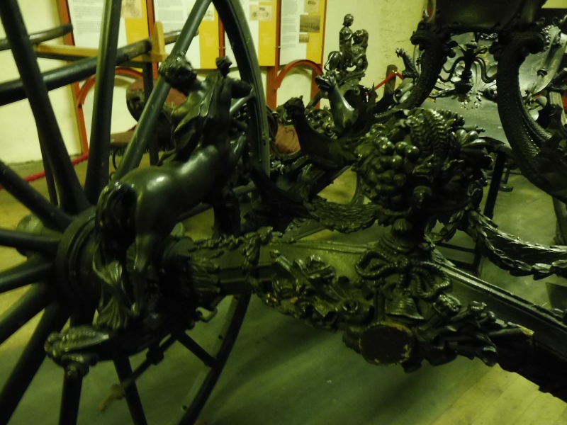 The wheels are enormous and iron shod. The hubs are carved with acanthus leaves and the brass axle caps have a star motif. The spokes are the only component of this carriage that have not been adorned with decoration.